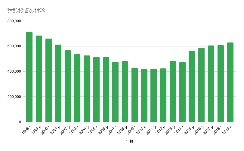 上記グラフを見ると、建設業界の労働人口が1998年以降大幅に下がっていることが分かります。
